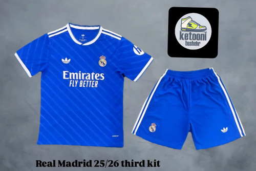کیت سوم وتیشرت با شورت هواداری تیم رئال مادرید ۲۰۲۶ رنگ آبی تایلندی کلاس A++ kit Real madrid 2026