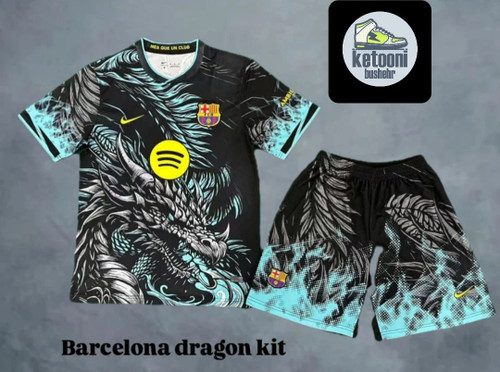 کیت وتیشرت با شورت طرح دراگون هواداری تیم بارسلونا ۲۰۲۶ رنگ مشکی فیروزه ای تایلندی کلاسA++ kit Dragon for barcelona 2026