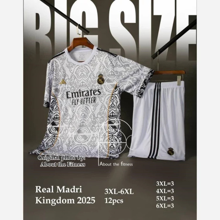 کیت تیشرت و شورت هواداری رئال مادرید 2025 2024 رنگ سفید طرح پادشاهی قواره بزرگ ارسال رایگان