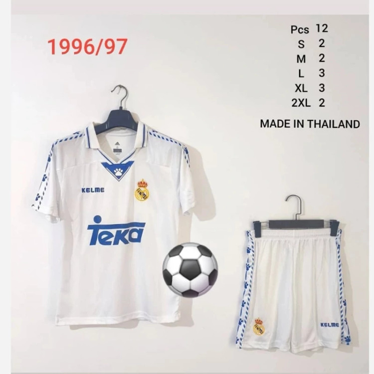 کیت تیشرت با شورت هواداری تیم رئال مادرید 1996 1997 طرح اصلی خانگی رنگ سفید تایلندی A++ سایز اسمال تا 2 ایکس لارج کیفیت عالی برای چاپ اسم و شماره ی دلخواه با توجه به چاپ متغیر 85تا130 جداگانه اخذ میشه