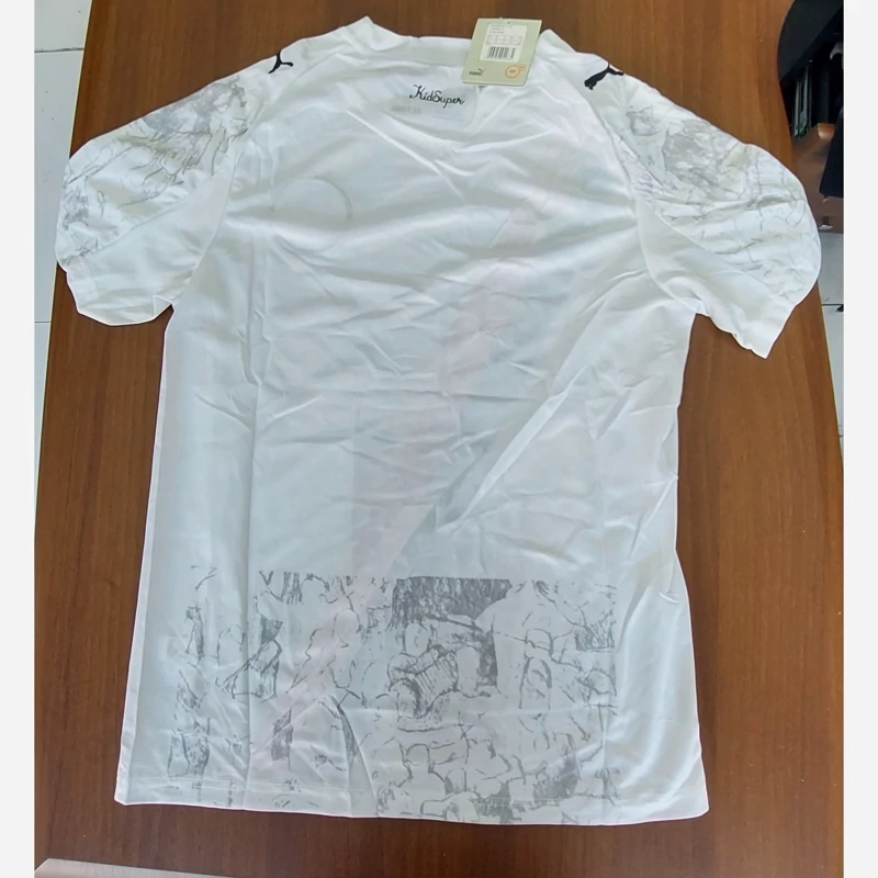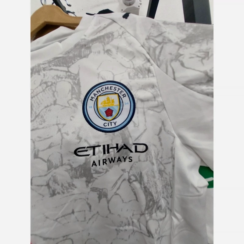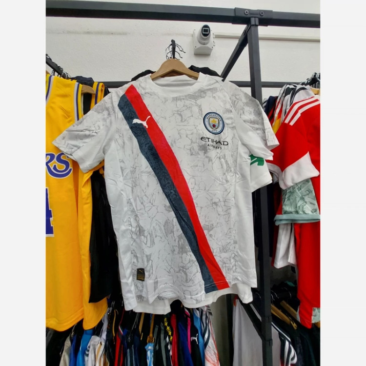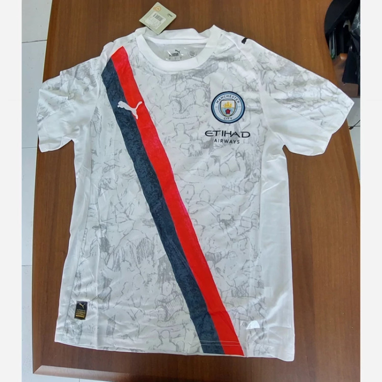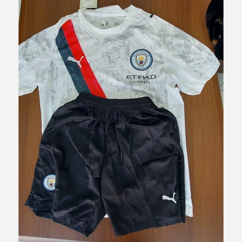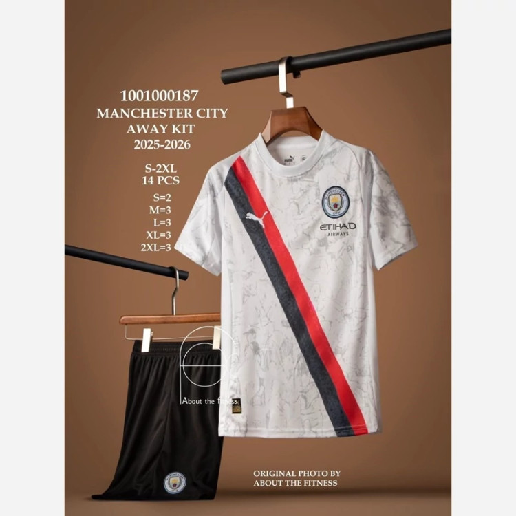 کیت تیشرت با شورت لباس دوم هواداری منچسترسیتی انگلیس 2026 رنگ سفید با نوار مشکی قرمز تایلندی A++ لوگو دوختی قبل از ثبت سفارش استعلام موجودی گرفته شود
