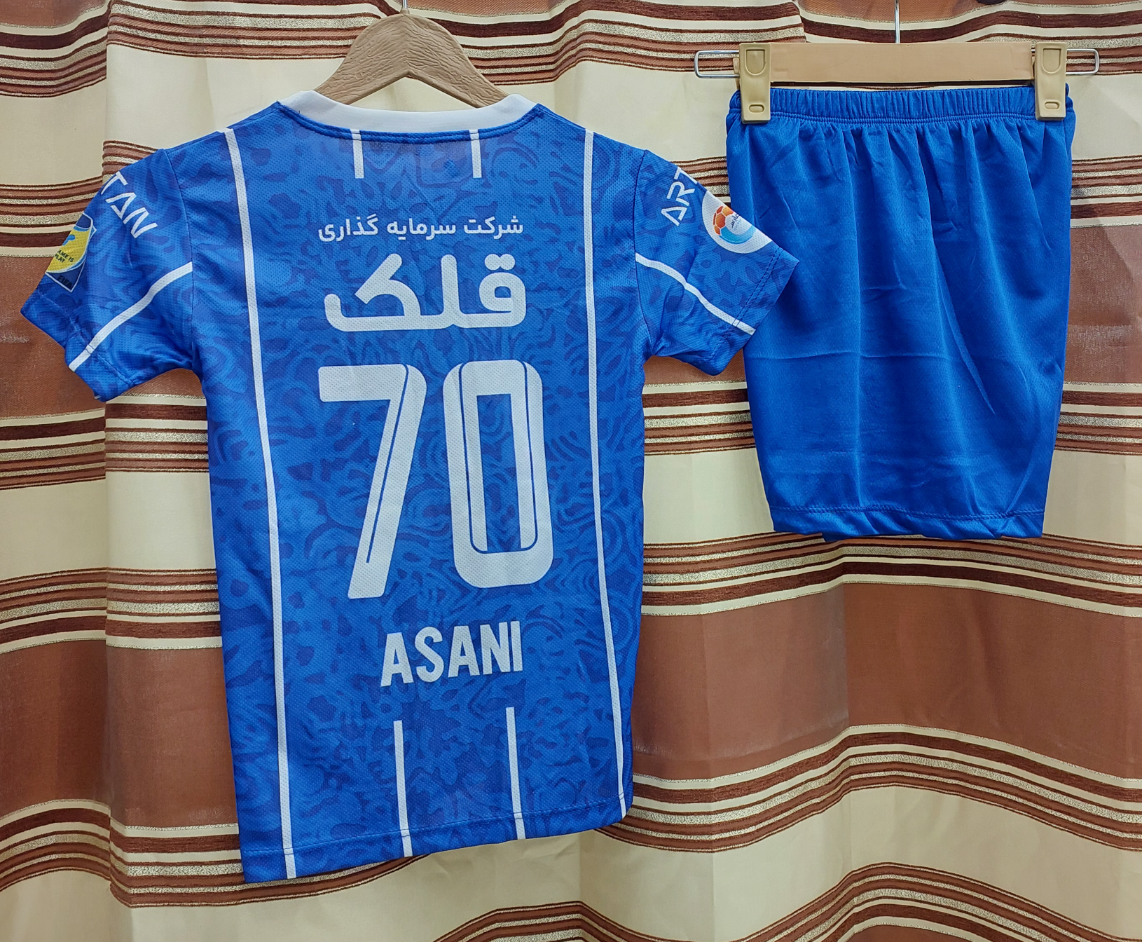 کیت تیشرت با شورت بچه گانه تیم استقلال ایران با شماره ۷۰ اسانی asani70 و شماره ۱۰ رامین رضائیان و ۱۷ منیر الحدادی