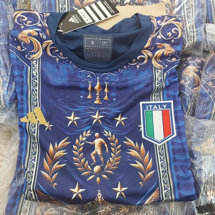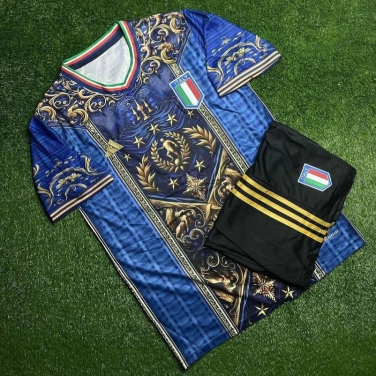 کیت تیشرت با شورت تیم ملی ایتالیا 2025 طرح ورساچه رنگ آبی طلایی تایلندی A++ ارسال رایگان
