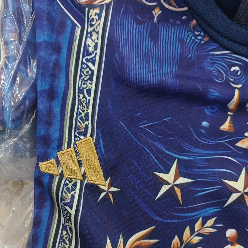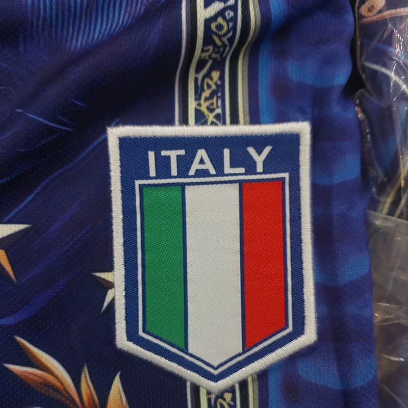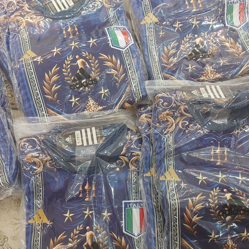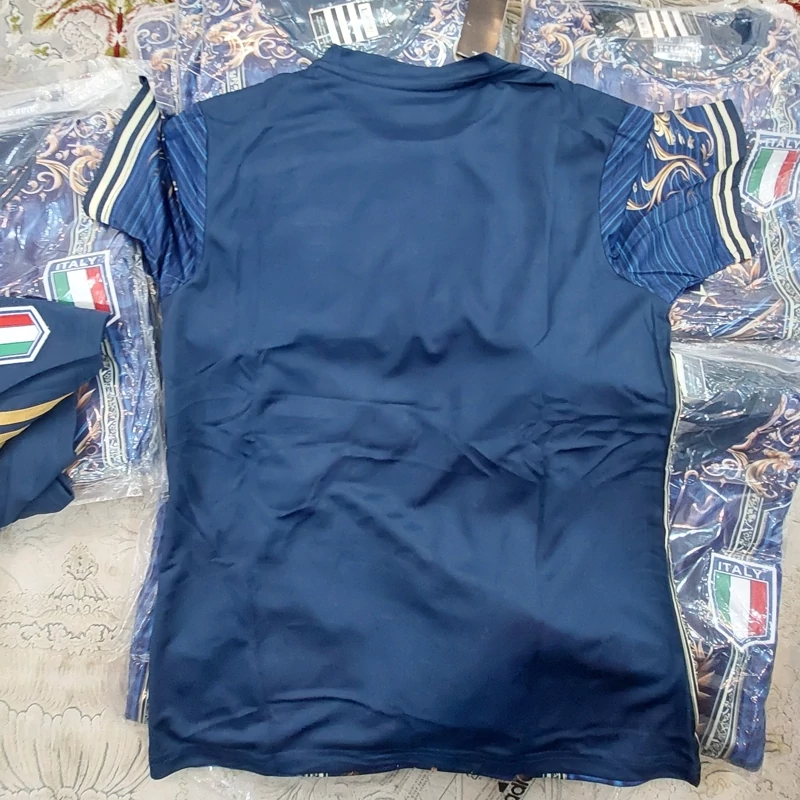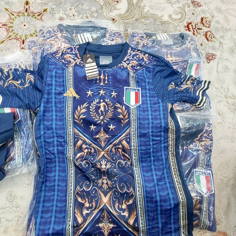 کیت تیشرت با شورت تیم ملی ایتالیا 2025 طرح ورساچه رنگ آبی طلایی تایلندی A++ ارسال رایگان