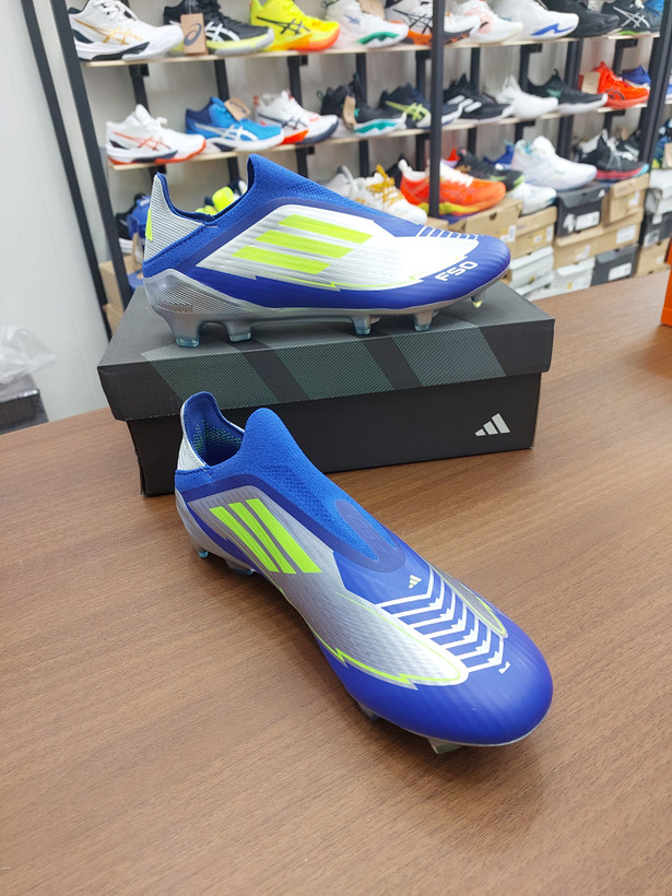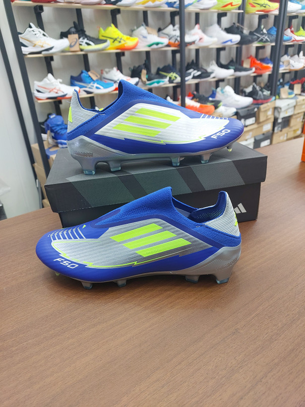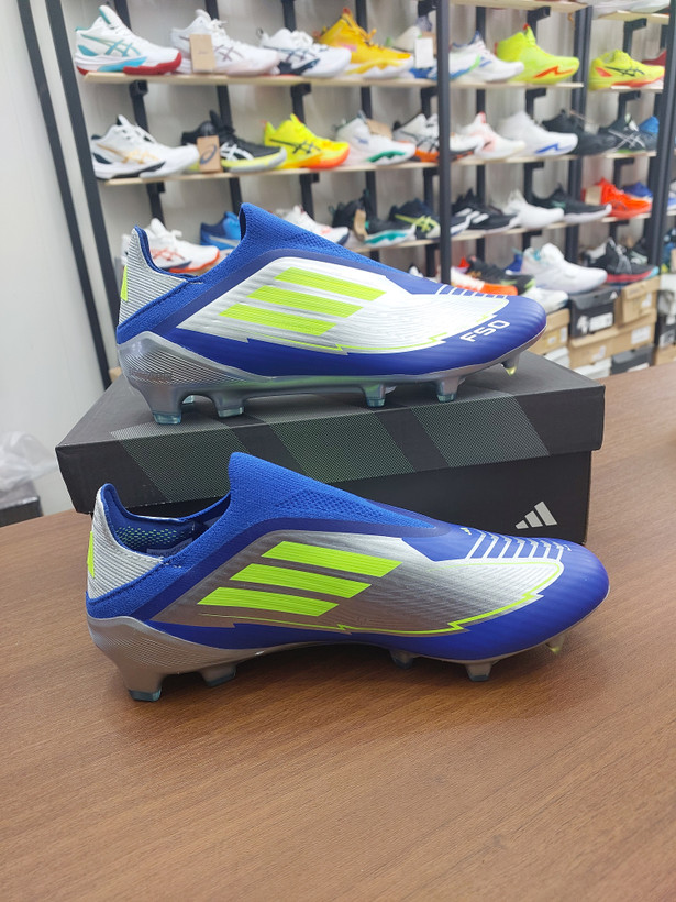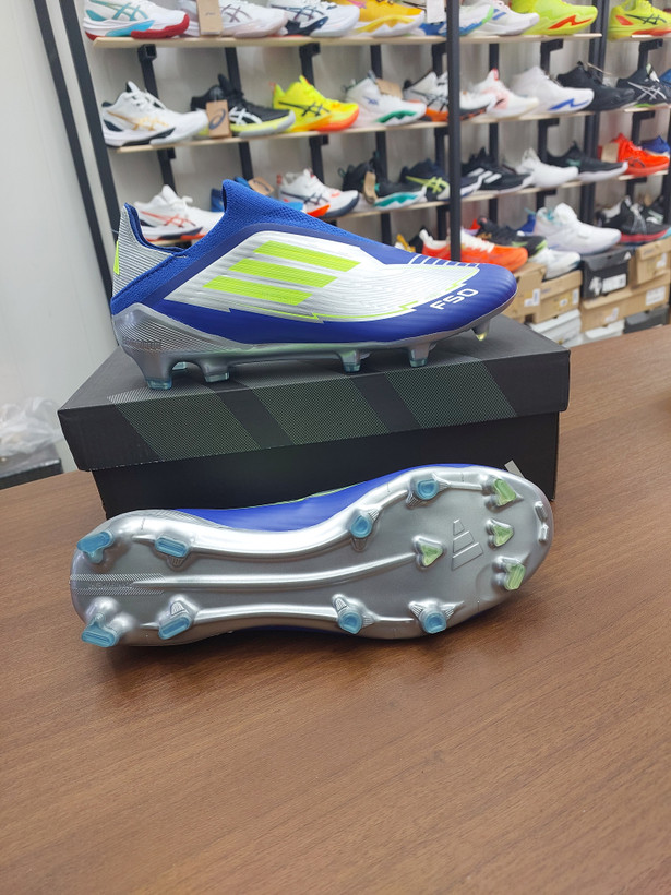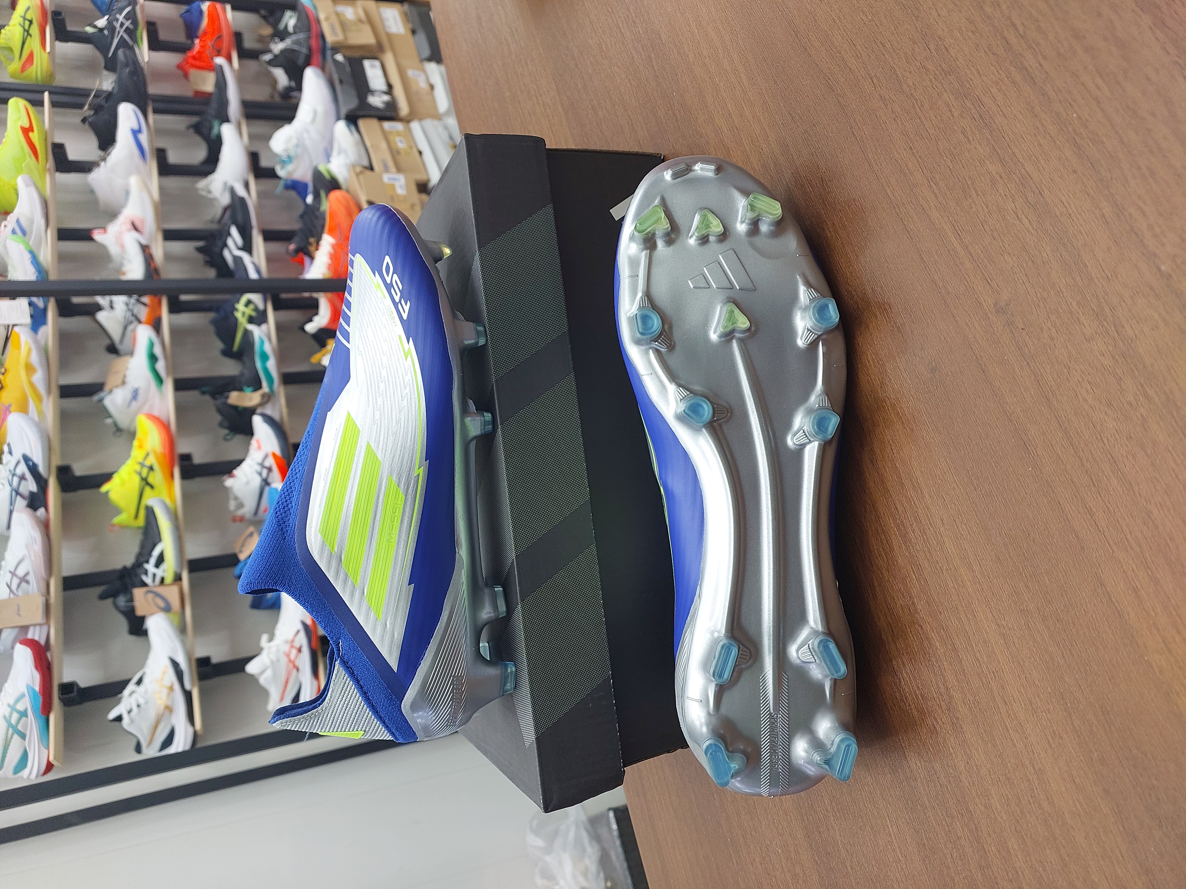 کفش فوتبال چمن آدیداس اف۵۰ مسی استوکدار بدون بند جورابی رنگ آبی فسفری Adidas f50