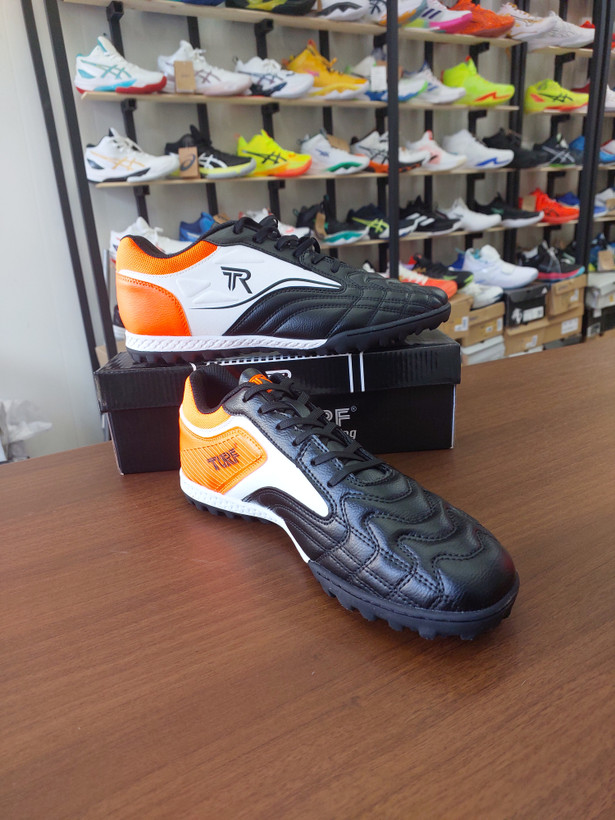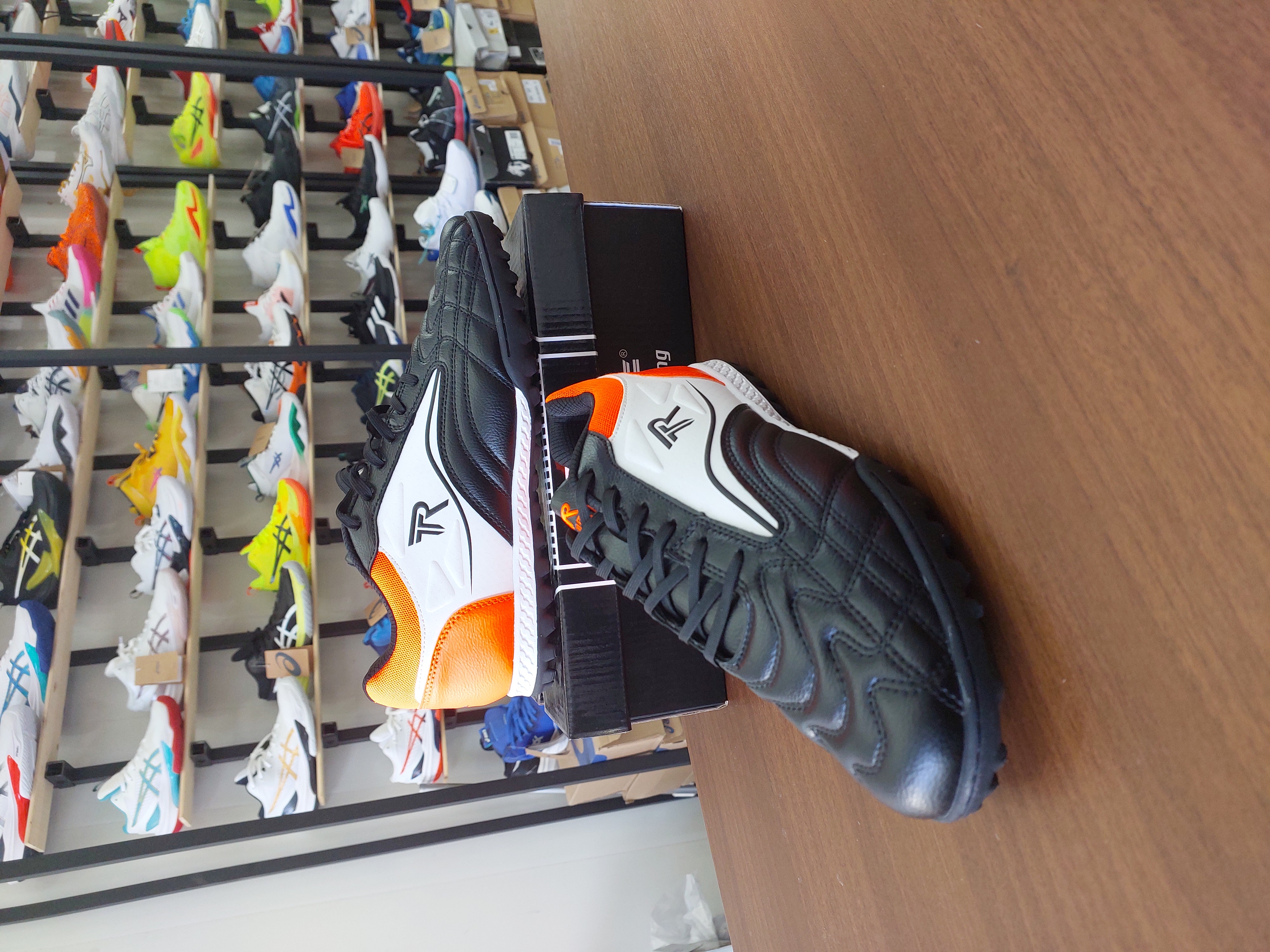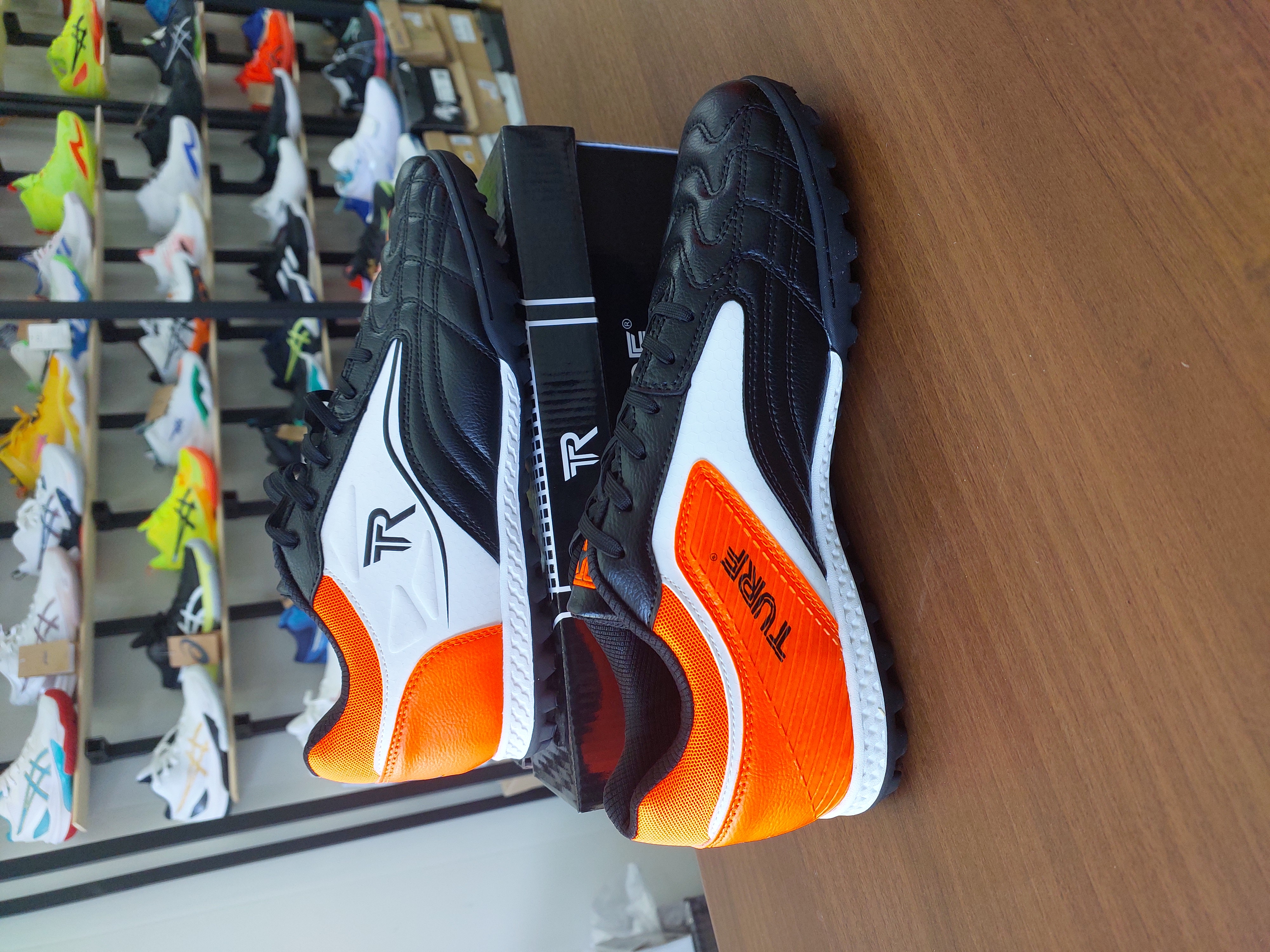 کفش فوتبال استوک ریز یا چمن مصنوعی تورف رنگ مشکی سفید نارنجی football shoes turf black white orange کفش فوتبال مصنوعی ساخت چین P.R C