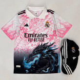 کیت تیشرت با شورت هواداری تیم رئال مادرید 2026 طرح دراگون تایلندی A++ رنگ صورتی مشکی فیروزه ای
