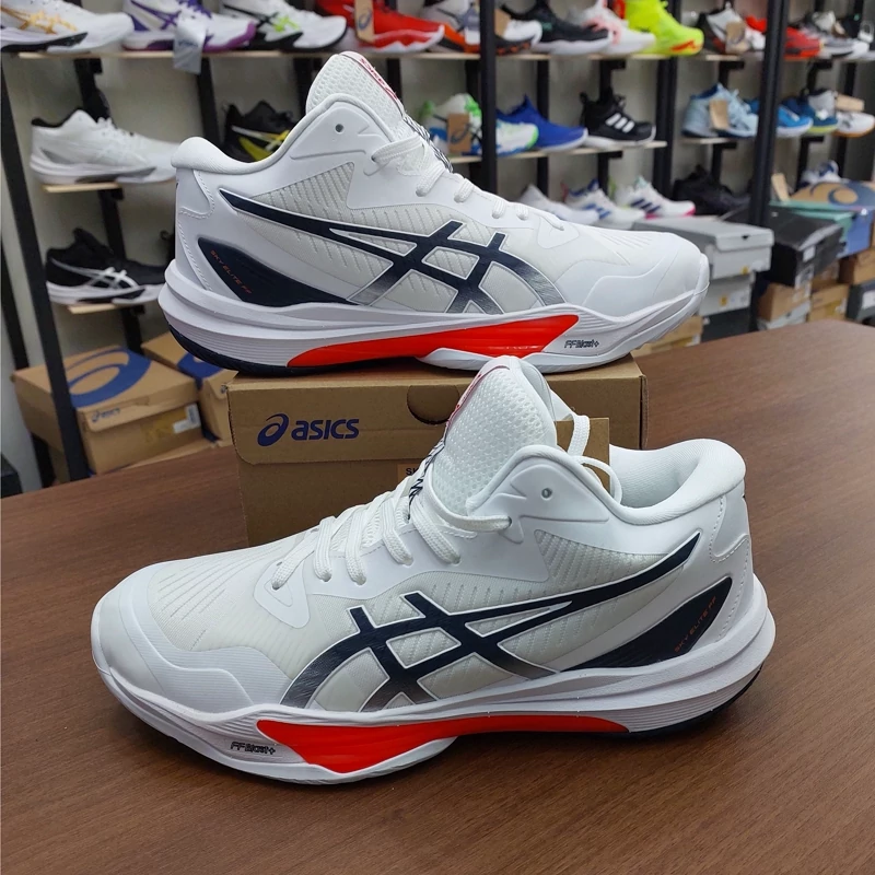کتونی والیبال هندبال بسکتبال اسیکس اسکای الیت3 مسترکوالیتی ویتنام asics sky elite ff mt3 رنگ سفید سورمه ای قرمز
